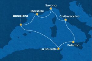 | 出港日 | ・バルセロナ 2026年 4/06~11/02まで毎週月曜日出港 ・チベタベッキア(ローマ) 2026年 4/10~10/30まで毎週金曜日出港 ・サボナ 2026年 4/11~10/31まで毎週土曜日出港 ・マルセイユ 2026年 4/12~11/01まで毎週日曜日出港 |